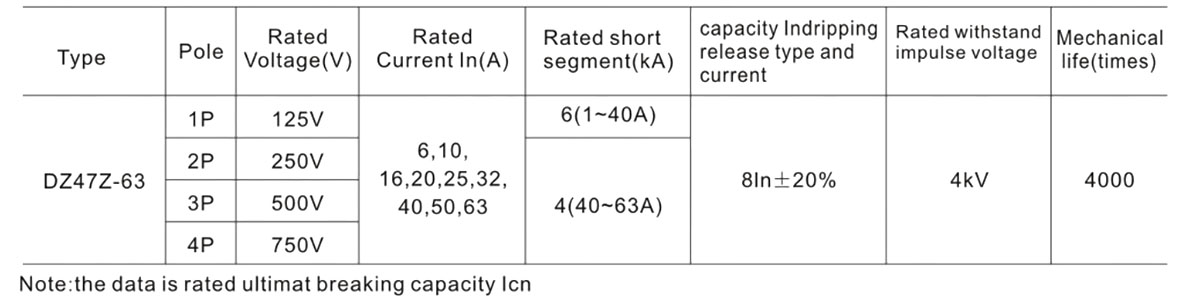 Miniaturowy wyłącznik serii DZ47Z został zaprojektowany w celu ochrony obwodów DC o napięciu znamionowym 750 V i prądu znamionowym 63A lub mniejszym z przeciążeń i zwarć w liniach, oświetleniu i elektrowni. Ponadto można go wykorzystać do sporadycznego przełączania linii i sprzętu w okolicznościach regularnych.